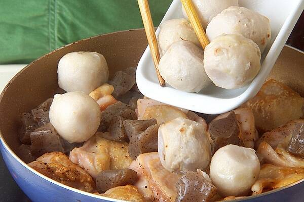 フライパンにサラダ油、ゴマ油を入れて中火にかけ、鶏肉にこんがりと焼き色をつける。里芋、コンニャクも加え炒めてあわせる。