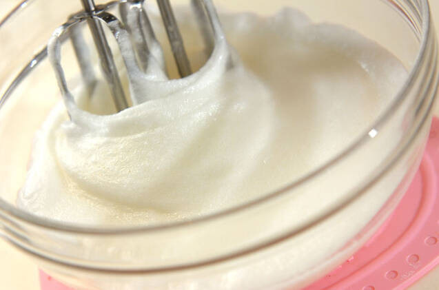 <メレンゲ>を作る。卵白に<デコ用メレンゲ>の残りを加えて、ビールの泡くらいまで泡立てる。砂糖を3回に分けて加え、角が立つまで泡立てる。