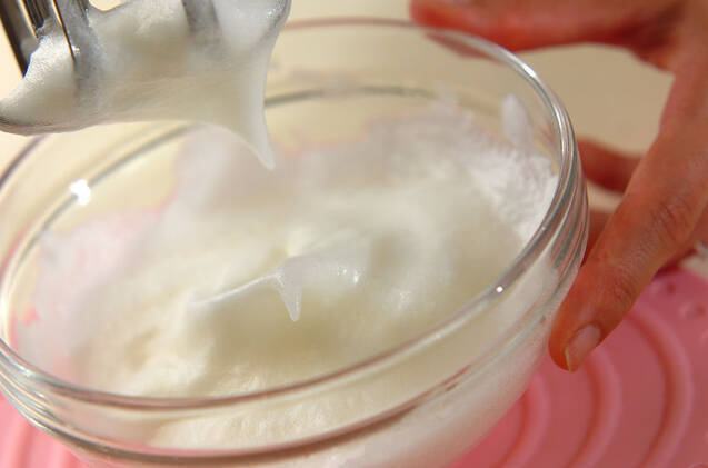 <デコ用メレンゲ>を作る。ボウルに卵白を入れてよくほぐし、砂糖を加える。角が立っておじぎするまで泡立てる。
