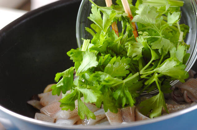 フライパンにオリーブ油、ニンニクを入れて中火にかけ、香りが立ってきたらアンチョビ、レーズンを加える。更にスルメイカ、サラダセロリ、パプリカを加えて炒め合わせる。