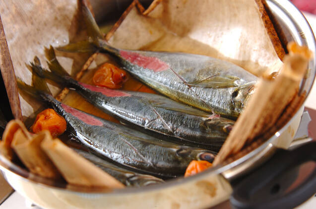 鍋に<調味料>を入れて強火にかけ、煮立ったらショウガを加える。あったら竹皮にアジの表側を上にして並べる。竹皮ごと煮立った鍋に入れ、梅干しも入れる。アジにヒタヒタより少し少ないくらいの量の分量外の水(400~500ml)を加える。