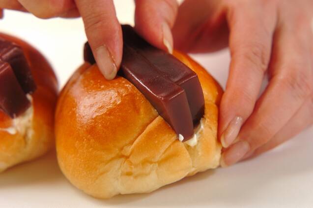 ロールパンの切り込みにマーガリンをぬり、水ようかんとホイップクリームを挟む。同様にもう1つ作り器に盛る。