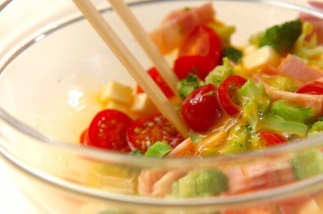 ボウルに<卵液>の材料を混ぜ合わせ、<具材>の材料を加える。