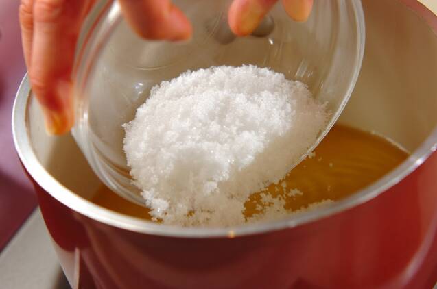 鍋に水とカモミールを入れ弱火で熱し、温まったら蓋をして2~3分置く。カモミールを取り出し、砂糖を加える。
