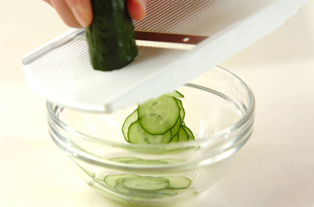 キュウリはスライサーで薄切りにし、全ての材料を混ぜ合わせる。