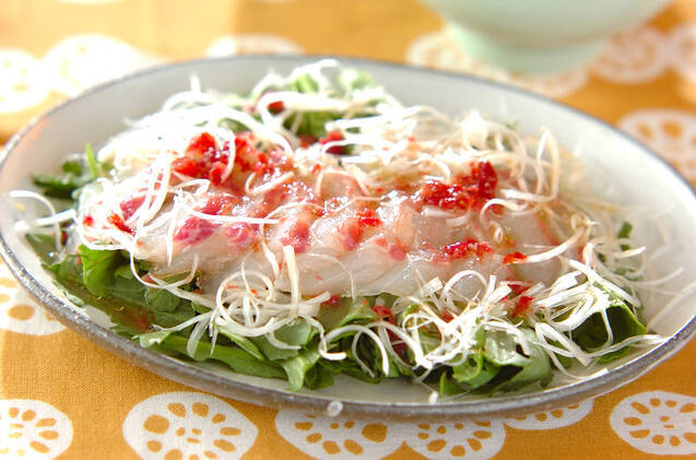 鯛に梅干しが入ったドレッシングをかけて、サッパリとしたサラダに。ゴマ油の風味が良いですね。