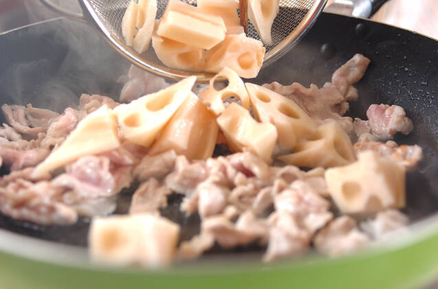 フライパンにサラダ油を加えて中火にかけ、豚肉を炒めて色が変わってきたら水気を切ったレンコンを加えて炒める。