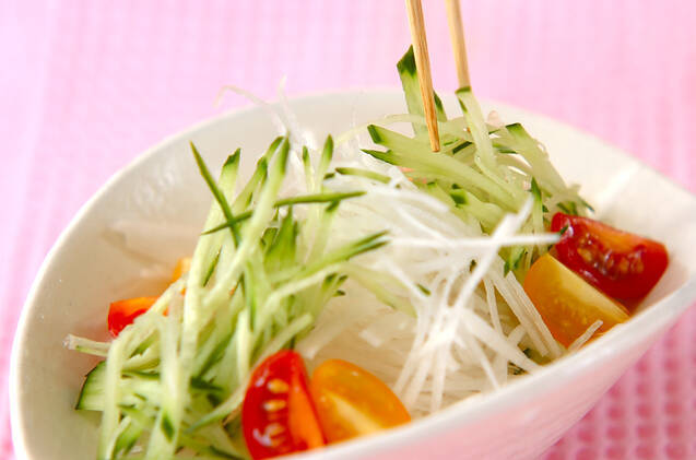 器に大根、キュウリ、プチトマトを盛り合わせ、食べる直前に<ドレッシング>を掛けていただく。