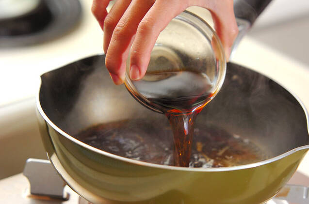 深めのフライパンにだし汁、ショウガを入れて強火で熱し、煮たったら<調味料>の材料を加える。