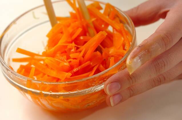 最後にニンジンを2分ゆでて湯をきり、<ニンジン調味料>の材料で和える。