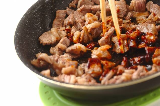 フライパンにサラダ油を熱して中火で牛肉を炒め、全体に火が通ったら火を止めて、<牛肉用調味料>の材料を和える。
