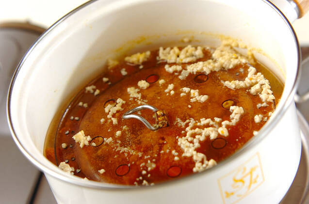 煮たってきたらショウガと鶏ひき肉を加え、再び煮たったら中火にし、<調味料>の材料を加える。カボチャに竹串がスッと刺さる位まで、落とし蓋をして10~12分煮る。