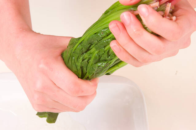 ほうれん草は特に根元をきれいに水洗いし、たっぷりの熱湯でサッとゆで水に取る。粗熱が取れれば水気を軽く絞って3cmの長さに切る。
