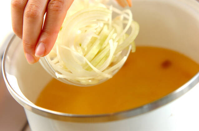 鍋に<スープ>の材料を入れて中火にかけ、固形チキンスープの素が煮溶けたら玉ネギを加え、しんなりするまで煮る。アクが出てきたら取る。