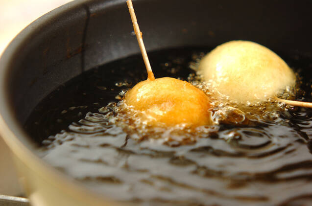180℃に熱した揚げ油でこんがりと揚げる。ケチャップとマスタードを添える。(ヒント)形が崩れやすいので衣をつけたらすぐに揚げましょう。