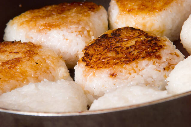 フライパンにサラダ油を引きおにぎりをのせ、両面美味しそうな焼き色をつける。半量に両面<タレ>をぬり、香ばしく焼く。