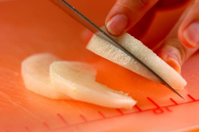 梨は皮をむいて8等分に切って芯を取り、さらに厚さ5mmの薄切りにする。冷凍パイシートは常温で少し柔らかくし、半分に切る。オーブンを200℃に予熱しておく。
