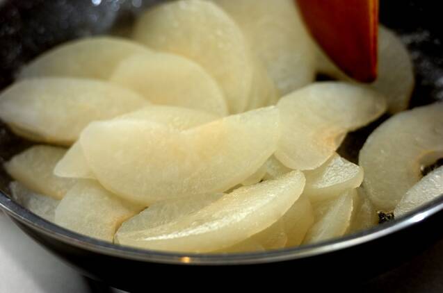<梨のソテー>を作る。フライパンに梨、砂糖、レモン汁を入れて全体にからめ、強火にかける。フツフツしてきたら火を弱め、フライパンに蓋をして時々ゆすりながら5~6分蒸し焼きにする。蓋を取り、さらに水分がなくなるまで加熱する。