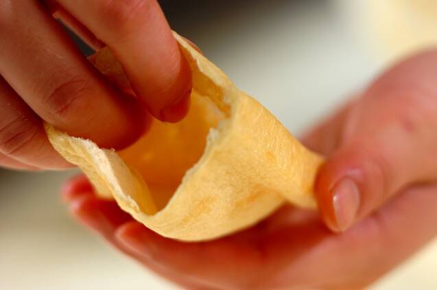 油揚げは半分に切って鍋に入れ、熱湯でゆでて油抜きをしてザルに上げる。粗熱が取れたら水気を絞り、麺棒をのせて軽く転がし、袋状にする。