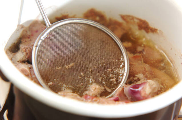 鍋に(1)、ニンニク、酒、水を入れて火にかける。煮たったらアクを取り、<調味料>の材料を加えて落とし蓋をし、煮汁が少なくなるまで煮る。