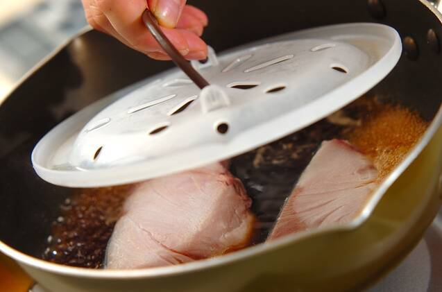 小さなフライパンに<調味料>の材料を入れて火にかけ、煮たってきたらブリを並べ入れて落とし蓋をし、火を弱める。途中で返しながら10分煮る。