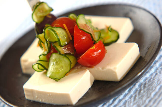 ボウルにナメタケ、プチトマト、キュウリを混ぜ合わせ、(1)の豆腐に盛る。