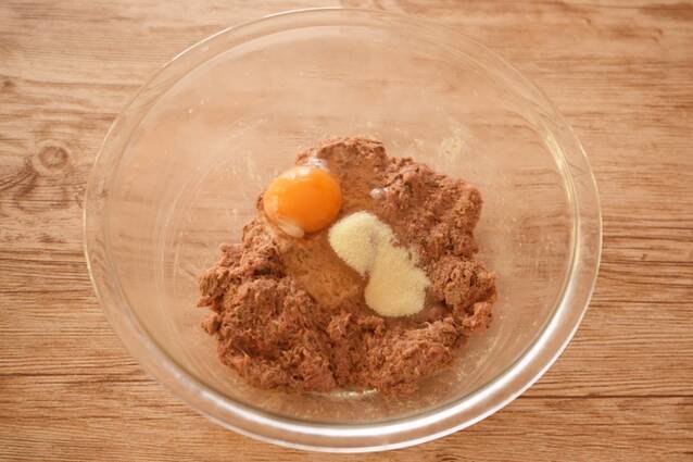 卵と粉ゼラチンを入れ、しっかりこね合わせる。最後に玉ネギを入れ、混ぜたら2等分にしてハンバーグの形に成型する。火が通りやすいように中心をくぼませる。