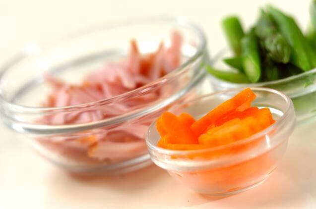 飾り用のニンジンは幅5mmに切り、型抜きで抜く。グリーンアスパラは根元のかたい部分を切り落とし、かたい皮とハカマを取り除き、4~5等分に切り、ニンジンと一緒に分量外の塩を入れた熱湯でゆでる。ハムは細切りにする。