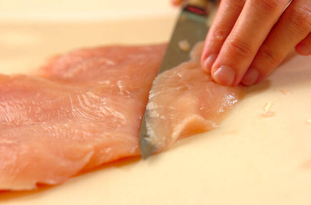 鶏むね肉は厚みを均一にし、6等分の削ぎ切りにし、塩コショウで下味をつける。