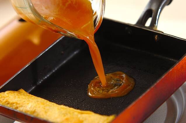 巻いた卵を向こうにすべらせて、手前の空いた所にもサラダ油を薄くひく。卵液の1/3量を、全体と巻いた卵の下にも流し入れる。