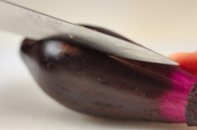 ナスはガクの部分に1周浅く切り込みを入れてガクを外し、皮に浅く縦に切り込みを3~4箇所入れる。