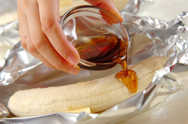 アルミホイルの上に皮をむいたバナナをのせ、その上にレモン汁、バター、メープルシロップをかけ、アーモンドを散らす。アルミホイルの口を閉じる。