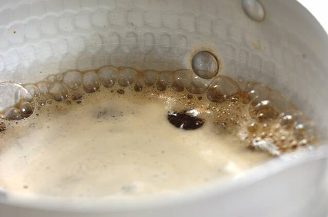 鍋にシイタケのもどし汁と<調味料>の材料を中火にかけ、ひと煮たちさせる。