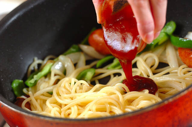 フライパンにサラダ油を中火で熱し、ソーセージ、玉ネギ、ピーマンを加えて炒め合わせる。玉ネギが少ししんなりしたら、スパゲティー、<調味料>の材料を加え炒め合わせる。