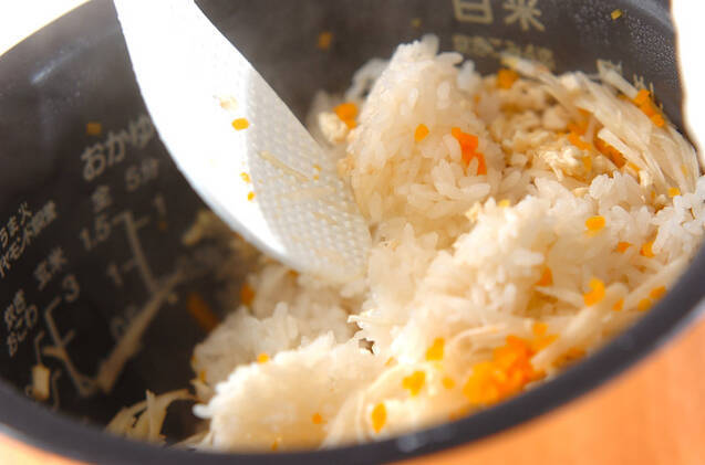 最後に昆布をのせてスイッチを入れ、炊き上がったら昆布を取り出す。炊飯器のご飯を底から持ち上げるように大きく混ぜ、余分な水分を飛ばす。