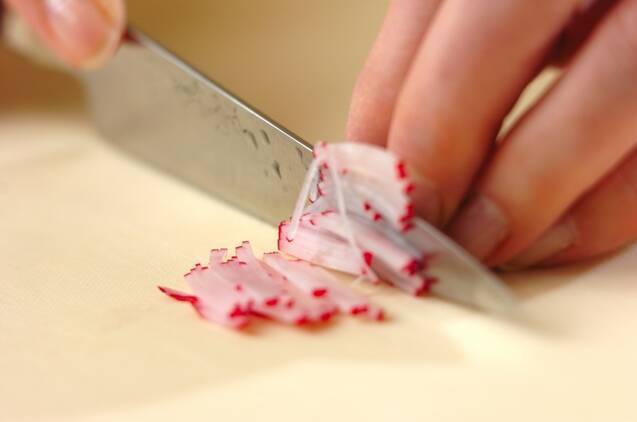 ラディッシュは1mm角の棒状に切る。<ドレッシング>の材料を混ぜ合わせる。