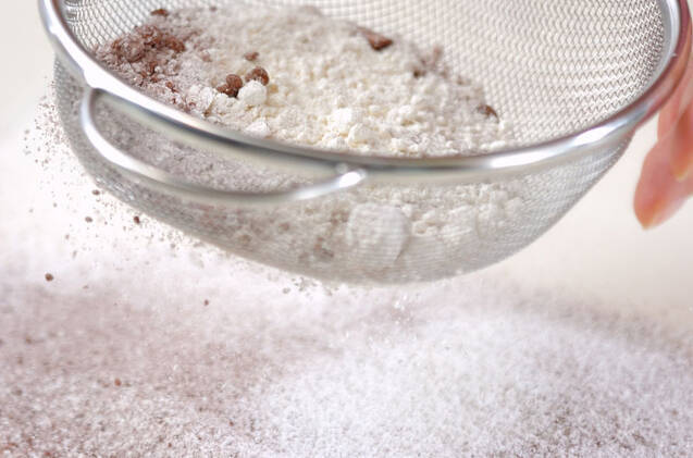 <生地>の薄力粉、ココア、ベーキングパウダーは合わせて振るっておく。耐熱容器にバターを入れ、ラップをかけ電子レンジで10〜20秒加熱して溶かしバターにする。電子レンジは600Wを使用しています。