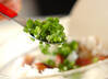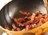 フライパンにベーコンとチリメンジャコを入れ、弱火でカリカリになるまで炒め、しょうゆを加える(ベーコンから出た脂はキッチンペーパーで拭き取って下さい)。