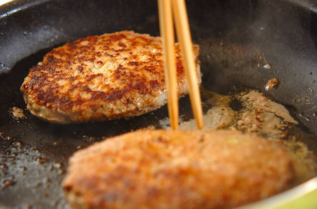 フライパンにサラダ油を強火で熱し、ハンバーグを並べ入れ、両面をそれぞれ40秒程焼いて焼き色を付け、うまみを封じ込める。