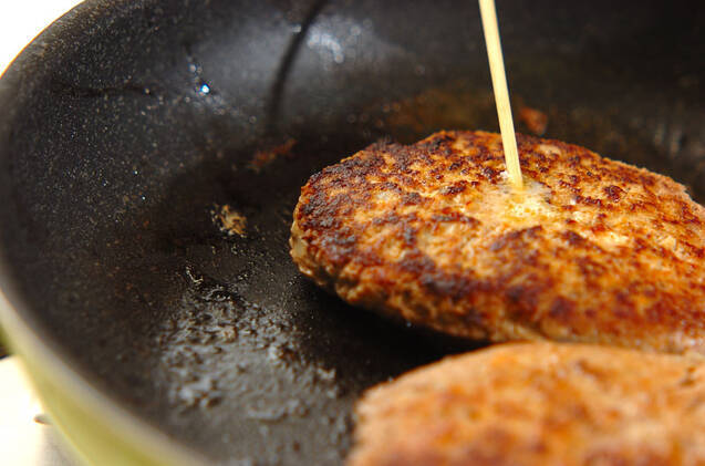 弱火にし、フライパンに蓋をして5~6分蒸し焼きにする。ハンバーグの中央に竹串を刺し、澄んだ汁が出たらOKです。ハンバーグは器に盛る。濁った赤い汁なら、もう一度蓋をして焼く。