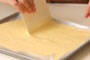 クッキングシートを敷いた天板に生地を流し入れ、カードを立てて隅にすき間ができないように広げる。