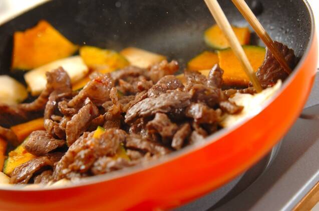 残りのサラダ油を入れ、カボチャ、エリンギを炒めて(1)の牛肉を戻し入れ、炒め合わせる。