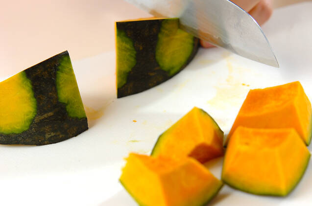 カボチャは種とワタをスプーン等で取り、所々皮を削ぎ落とす。大きさを揃えて4cm角位に切り、水に7~8分放つ。