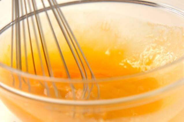 ボウルに卵を溶きほぐし、グラニュー糖を加えて混ぜ合わせる。