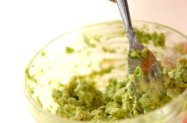 <アボカドディップ>を作る。アボカドにマヨネーズ、タバスコ、塩コショウを混ぜ合わせる。