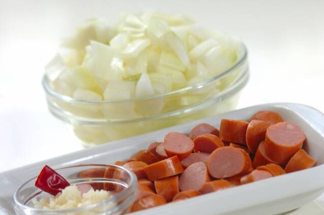 ソーセージは輪切りにする。玉ネギは8mmの角切りに、ニンニクはみじん切りにする。赤唐辛子は種を除く。