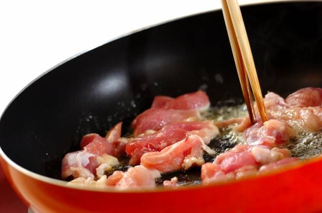 フライパンにサラダ油とバターを入れ、中火にかける。バターが溶けはじめたら、鶏もも肉を入れて炒める。