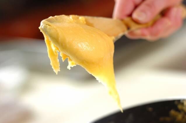 溶きほぐした卵を少しずつ加えて混ぜ、木ベラですくってみて3秒くらいかけて落ち、木ベラから伸びた生地がきれいな三角形になるくらいのやわらかさにする。