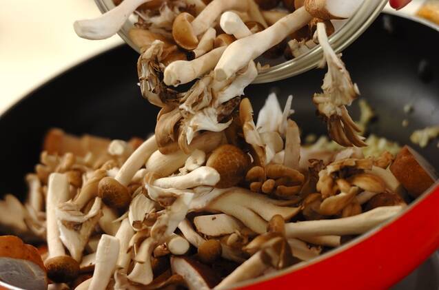 フライパンにオリーブ油を熱し、ニンニク、赤唐辛子を入れて炒め、香りがたってきたらキノコ類、トマト、ローズマリー、タイム、ローリエを加えて炒める。