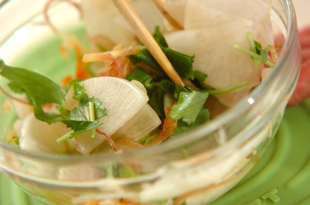 大根がしんなりしたらよく水気を絞り、(1)にミツバと共に加えて和え、器に盛る。